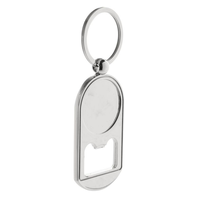 Abrebotellas metálico con llavero y cúpula de epoxi. En caja de regalo negra. El precio incluye la impresión de la cúpula de epoxi. Cantidad mínima: 100 unidades