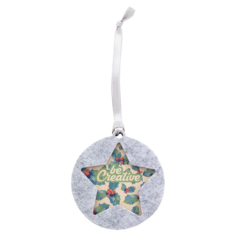 Adorno de árbol de Navidad hecho a medida, de doble capa de fieltro RPET y contrachapado de abedul con cinta plateada completa y diseño navideño troquelado en la capa superior. El precio incluye impresión LED UV en la capa inferior. Cantidad mínima: 100 unidades