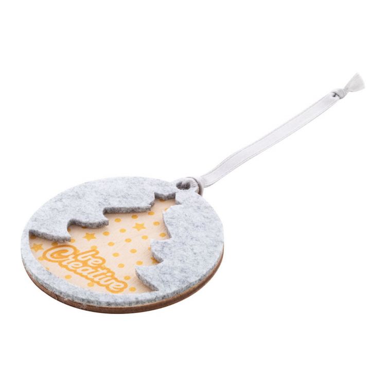 Adorno de árbol de Navidad hecho a medida, de doble capa de fieltro RPET y contrachapado de abedul con cinta plateada completa y diseño navideño troquelado en la capa superior. El precio incluye impresión LED UV en la capa inferior. Cantidad mínima: 100 unidades