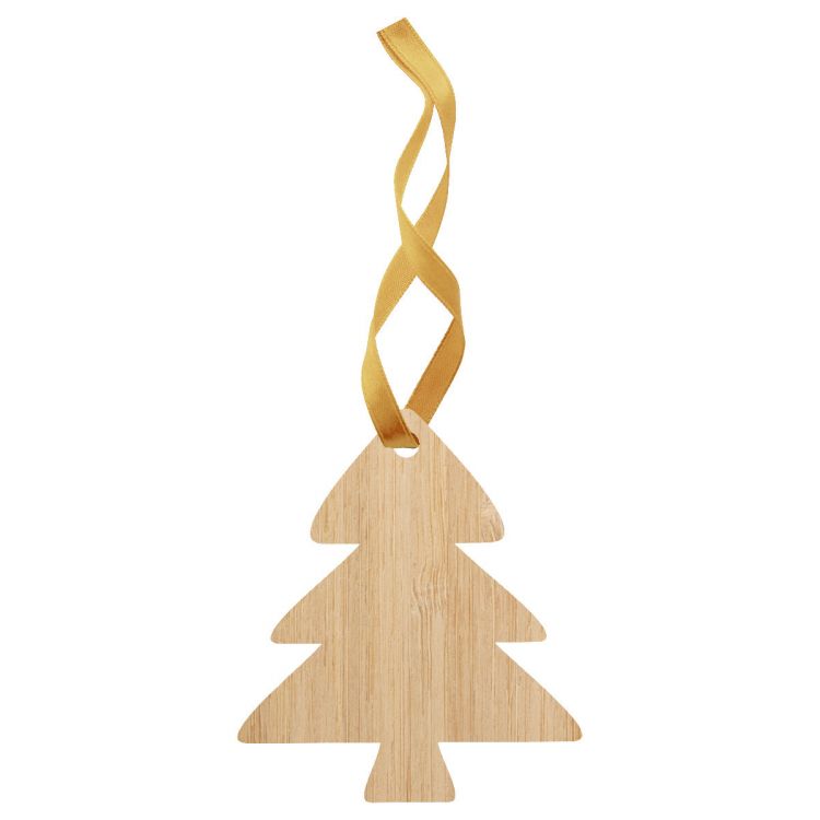 Adorno para árbol de Navidad en contrachapado de bambú con cinta dorada. Se entrega con cinta suelta