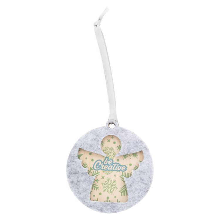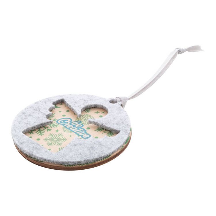 Adorno de árbol de Navidad hecho a medida, de doble capa de fieltro RPET y contrachapado de abedul con cinta plateada completa y diseño navideño troquelado en la capa superior. El precio incluye impresión LED UV en la capa inferior. Cantidad mínima: 100 unidades