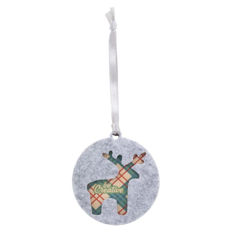 Adorno de árbol de Navidad hecho a medida, de doble capa de fieltro RPET y contrachapado de abedul con cinta plateada completa y diseño navideño troquelado en la capa superior. El precio incluye impresión LED UV en la capa inferior. Cantidad mínima: 100 unidades