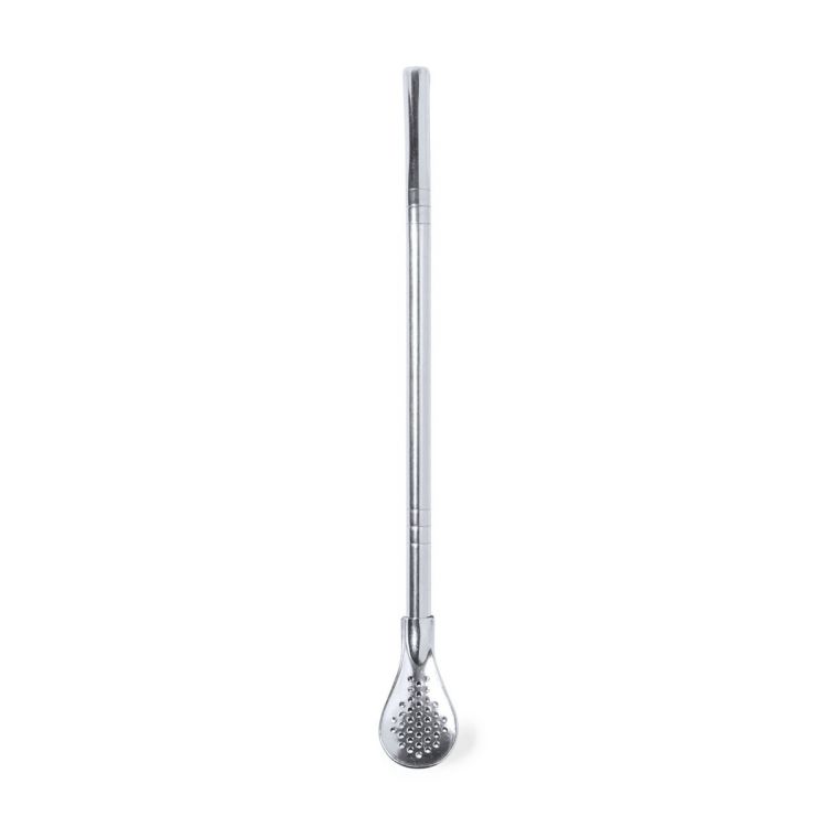Práctico agitador con pajita en acero inox. Con diseño elegante y funcional, este accesorio es esencial para bebidas frías o calientes. Pajita integrada que permite absorber con facilidad y en el extremo inferior una práctica cucharilla con filtro. Presentado en una bolsa individual. (color plata)