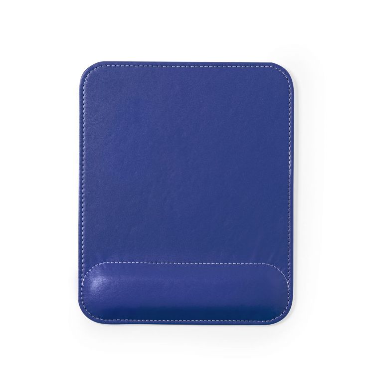 Alfombrilla para ratón fabricada en suave polipiel, con contraste de color blanco en las costuras. Base antideslizante y reposa muñecas acolchado para prevenir el estrés y el dolor en las articulaciones. Presentada en estuche individual. (color azul)