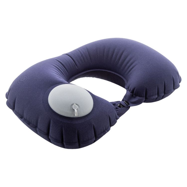 Almohada de viaje inflable de poliéster RPET con bomba incorporada para inflarla y desinflarla fácilmente. En bolsa con cordón a juego. Con etiqueta distintiva de RPET.