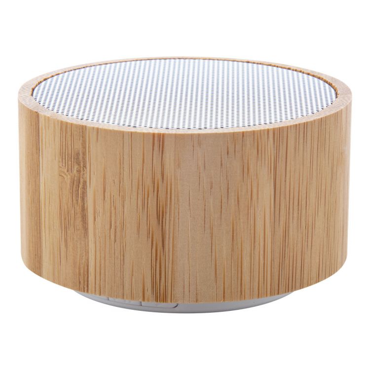 Altavoz inalámbrico en carcasa de bambú con función de llamada manos libres, radio FM y batería recargable incorporada. Incluye cable cargador USB