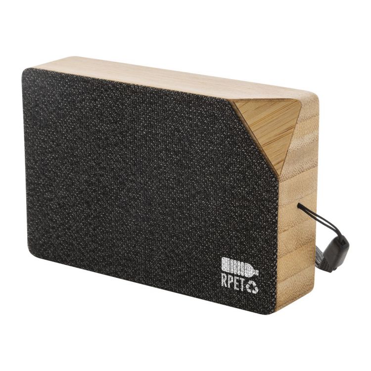 Altavoz inalámbrico de bambú con malla de poliéster RPET, cargador solar integrado, correa de transporte y batería recargable (300 mAh). Incluye cable de carga USB