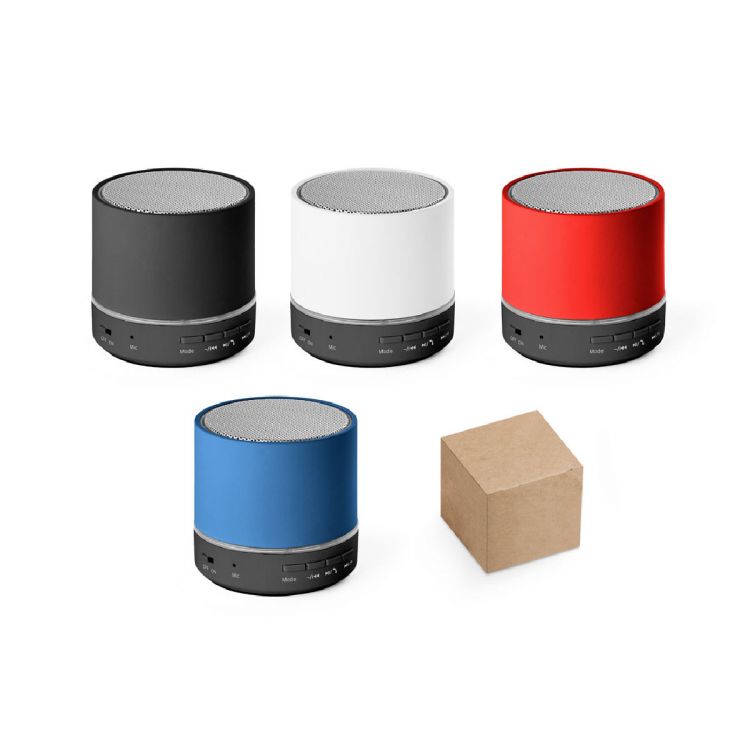 Altavoz portátil de forma redonda, perfecto para acompañarte durante todo el día. Con aproximadamente 4.5 horas de batería y micrófono integrado. Si no eliges personalización, la rejilla se entrega suelta dentro de la caja de regalo. Una vez colocada, no se puede volver a quitar.Material: ABS reciclado (100 % rABS)Transmisión inalámbrica: Bluetooth v5'3Capacidad: 400 mAhAutonomía aproximada: 4 h 30 minTiempo de carga aproximado: 1 h 40 minEntrada: USB-C (1.5 W), micro SD, USB-A, 3.5 mmAltavoz: Respuesta de frecuencia: 280 Hz - 16 kHzRelación señal-ruido: ≥ 95 dBSensibilidad: 50 ±3 dBDistorsión armónica: ≤ 1 %Impedancia: 4 ΩDiámetro del altavoz: Ø 52 mmPotencia de sonido: 3 WMicrófono: Respuesta de frecuencia: 20 Hz - 16 kHzSensibilidad: -45 ±3 dBV/PaCaracterísticas: Manos libresRejilla totalmente personalizableIncluye: Cable USB-A / USB-CSuministro: Caja de regalo en papel kraft reciclado, que puede reutilizarse como soporte para smartphone ø60 x 58 mm | Caja: 65 x 63 x 75 mm