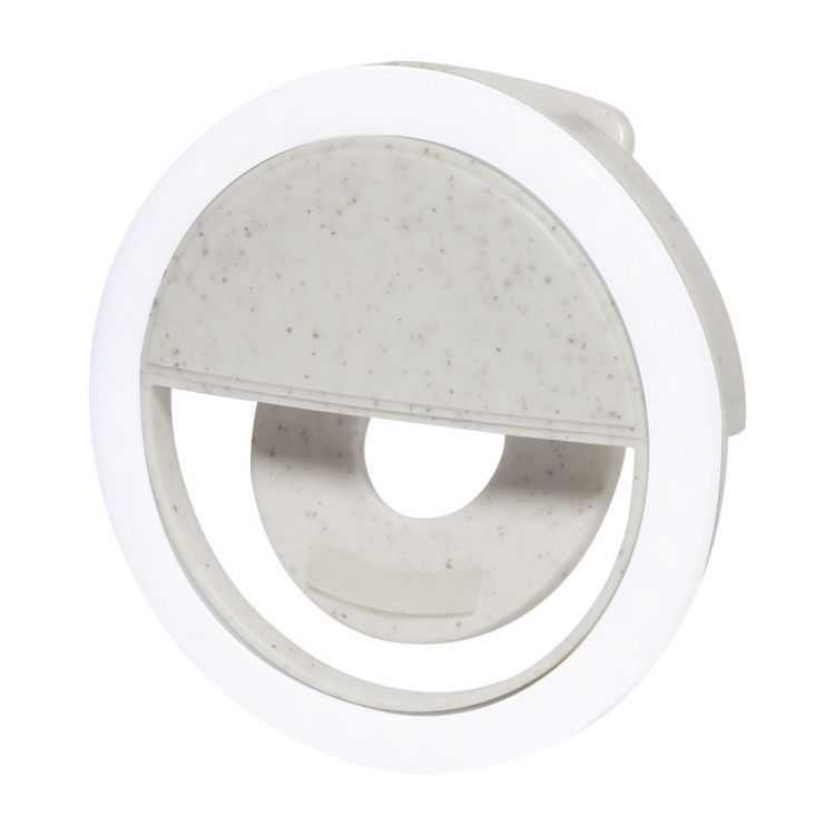 Anillo luminoso selfie ecológico de plástico de paja de trigo con 36 LED para teléfonos móviles. Con 3 niveles de brillo ajustables y batería recargable incorporada. Incluye cable cargador USB, de color natural