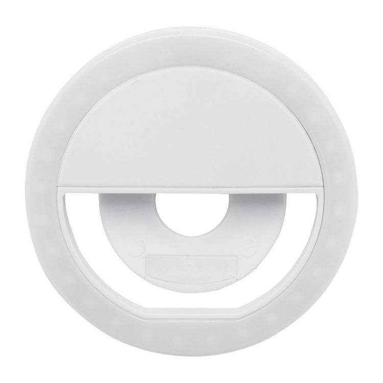 Anillo luminoso selfie de ABS reciclado con 28 LED para teléfonos móviles. Con 3 niveles de brillo ajustables y batería recargable incorporada (150 mAh). Incluye cable cargador USB, de color blanco