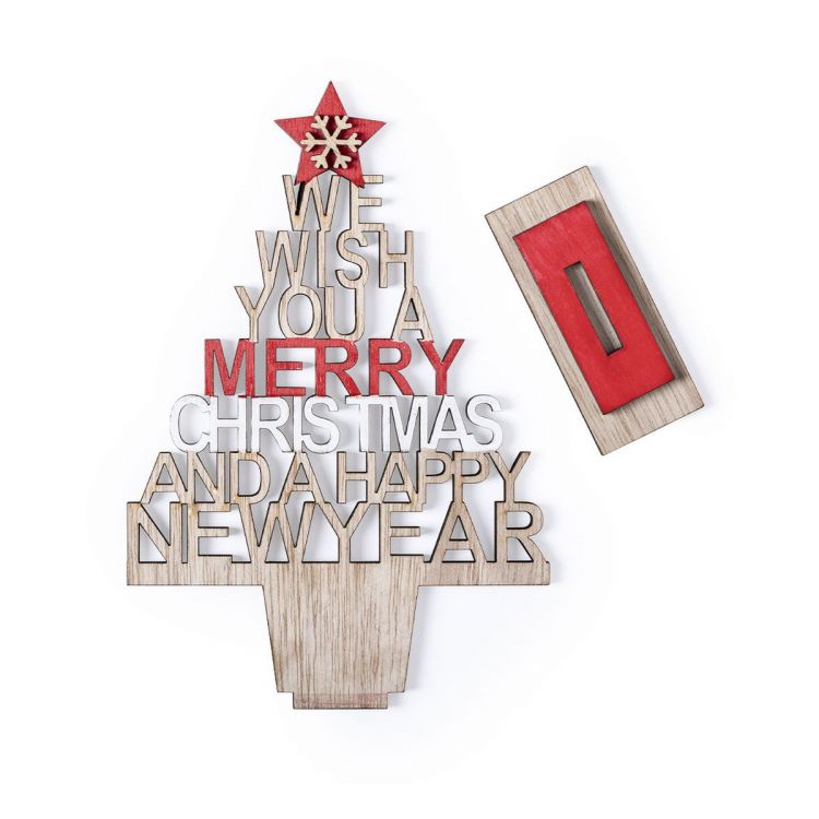 Original árbol de navidad con mensaje troquelado. Fabricado en madera, con amplia superficie de marcaje. Base desmontable y presentado en bolsa individual (color natural)