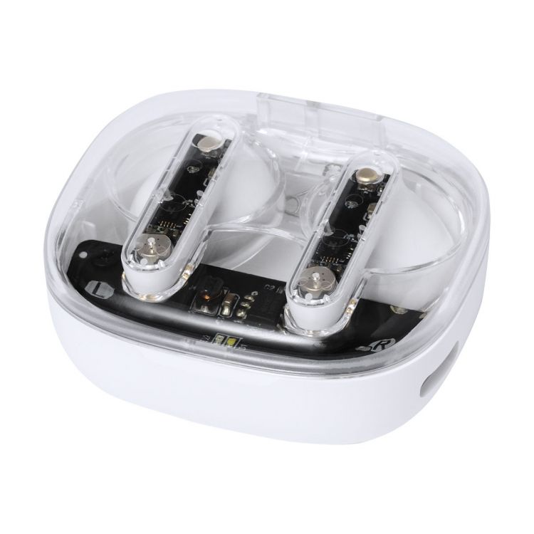 Auriculares semitransparentes estéreo inalámbricos (TWS) con componentes electrónicos visibles y función de llamada manos libres. En estuche cargador de plástico semitransparente. Incluye cable cargador USB, de color blanco