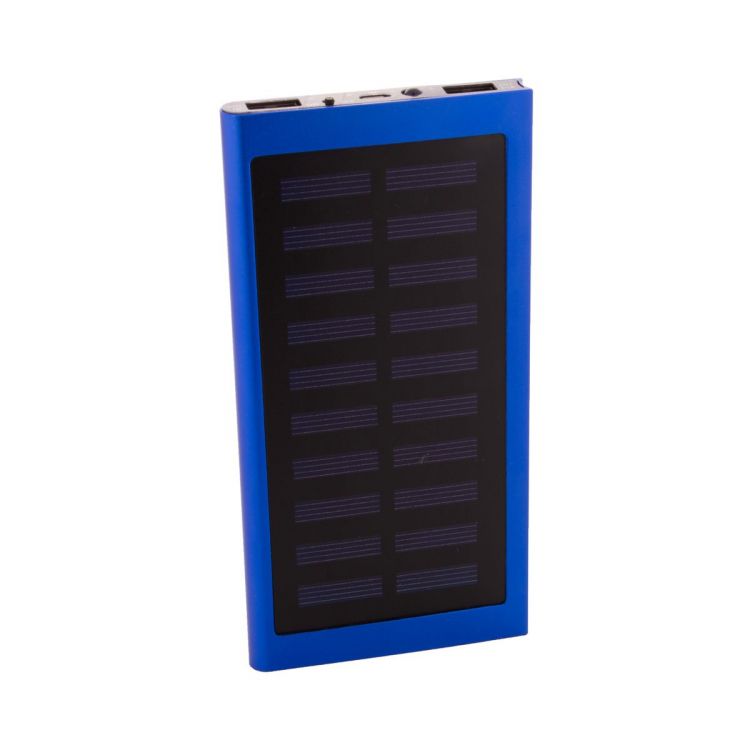 Power bank USB en carcasa de aluminio reciclado con cargador solar integrado y batería de 4000 mAh. Con 2 puertos de carga USB y 1 USB-C. Puerto de entrada USB-C. Incluye cable de carga USB.