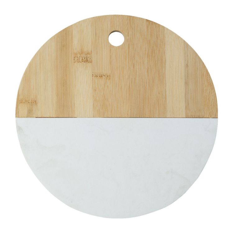 Tabla de servir de bambú y piedra con aspecto de mármol. Con un orificio para el pulgar.