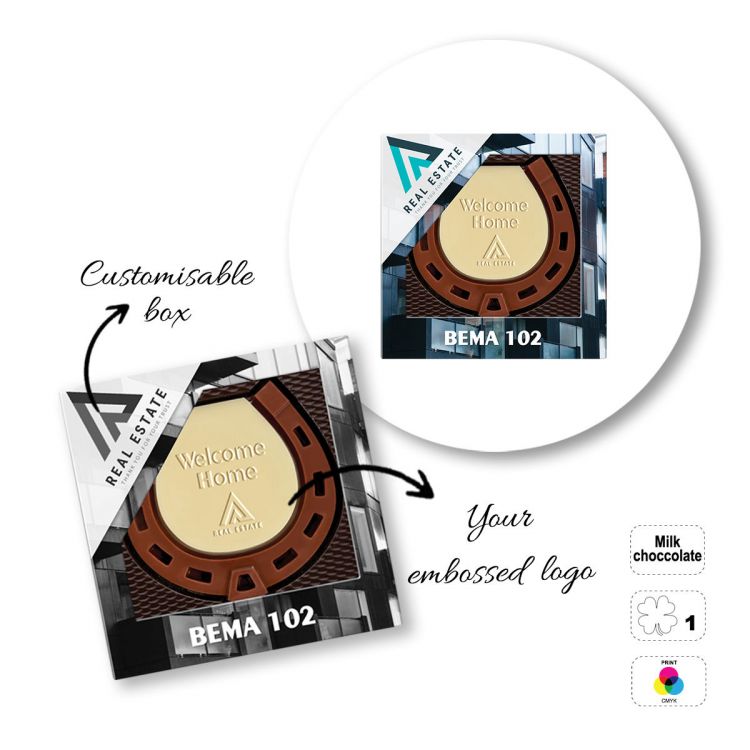Barra de chocolate con leche, con diferentes formas. Las letras del código del producto corresponden al tipo de barrita: A- trébol de cuatro hojas (65 g), B- herradura (65 g), C- camiseta (65 g), D- pelota (65 g), E- círculo (65 g), g), F- n°1 (65 g). Embalaje: caja de papel totalmente personalizable (acabado del papel: blanco o kraft, a elegir en el pedido), bandeja preformada realizada con rPET. Posibilidad de personalización en relieve en la superficie de la barra. Vida útil mínima: 8 meses.