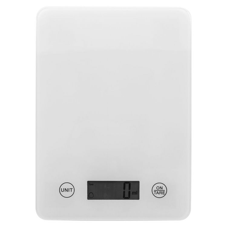 Báscula de cocina digital con plataforma de pesaje de vidrio templado y batería recargable USB integrada (200 mAh). Capacidad: 5 kg, graduación 1 g, unidades de medida: g/oz. Con indicador de ml de agua/leche. Incluye cable de carga USB