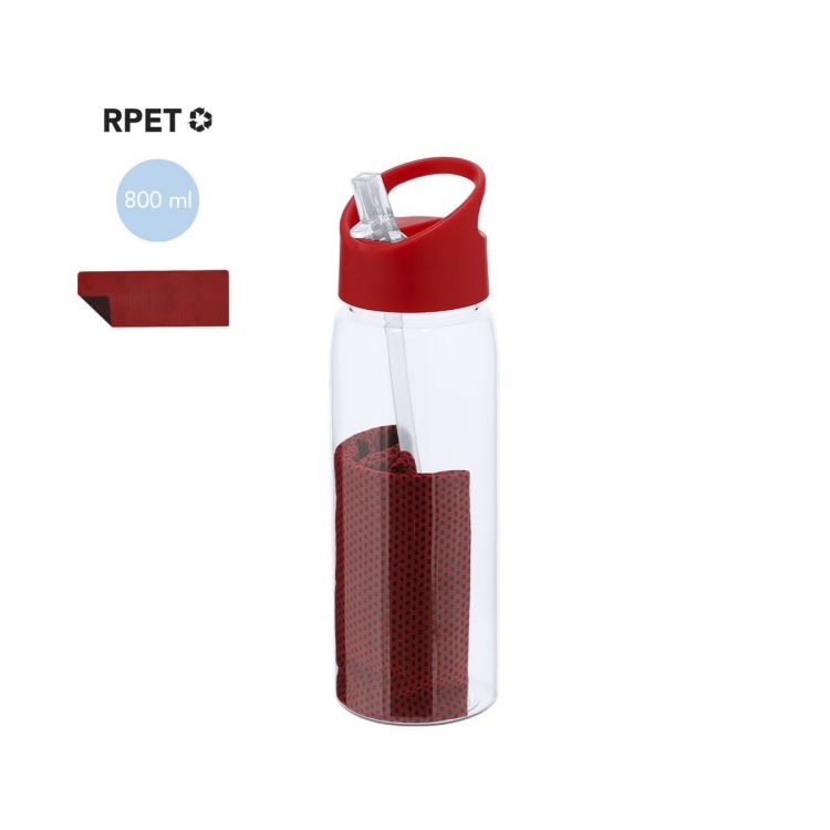 Set de bidón y toalla fabricados en RPET. Bidón de 800 ml de capacidad con sistema de fácil apertura libre de BPA con dosificador de pajita y asa de transporte a juego y toalla a juego de 30x80cm. El material RPET se elabora a partir de plástico reciclado, para así fomentar la reutilización de residuos plásticos y ayudar a la sostenibilidad del planeta.