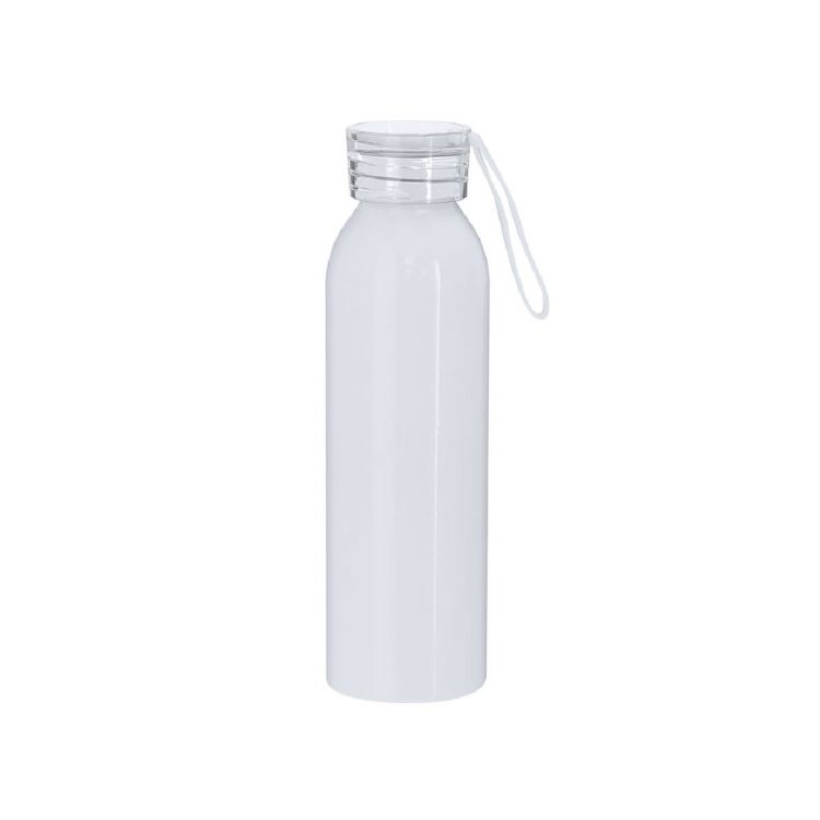 Bidón de 650 ml de capacidad fabricado en resistente aluminio. En color blanco brillante, especialmente diseñado para la sublimación. Con tapón a rosca translúcido y correa a juego para un sencillo transporte. Libre de BPA. (color blanco)