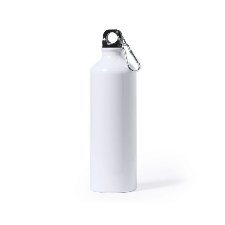 Bidón de aluminio de 800ml de capacidad. Acabado en suave y brillante color blanco, especialmente diseñado para marcaje en sublimación. Con tapón de seguridad a rosca y mosquetón metálico de transporte. Presentado en atractiva caja de diseño. (color blanco)