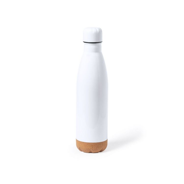 Bidón de 750 ml de capacidad, fabricado en acero inox y especialmente diseñado para marcaje en sublimación. De acabado blanco brillo, con tapón a rosca a juego y base en corcho natural. Libre de BPA y presentado en caja individual de diseño kraft. Disponible manual de instrucciones en español e inglés. (color blanco)