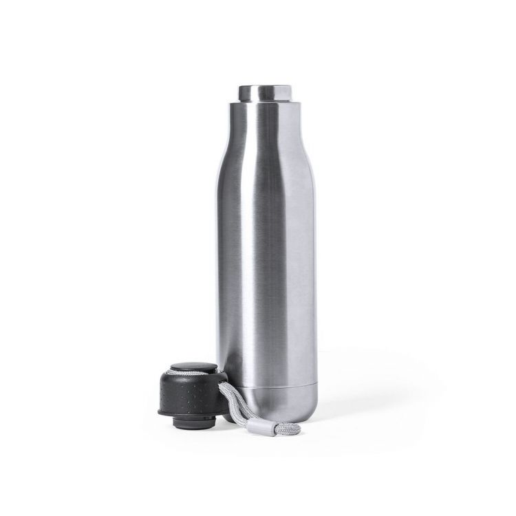 Bidón térmico de acero inox y doble pared de 830ml de capacidad y de acabado brillo. Tapón de seguridad libre de BPA y presentado en atractiva caja de diseño. (color plata)