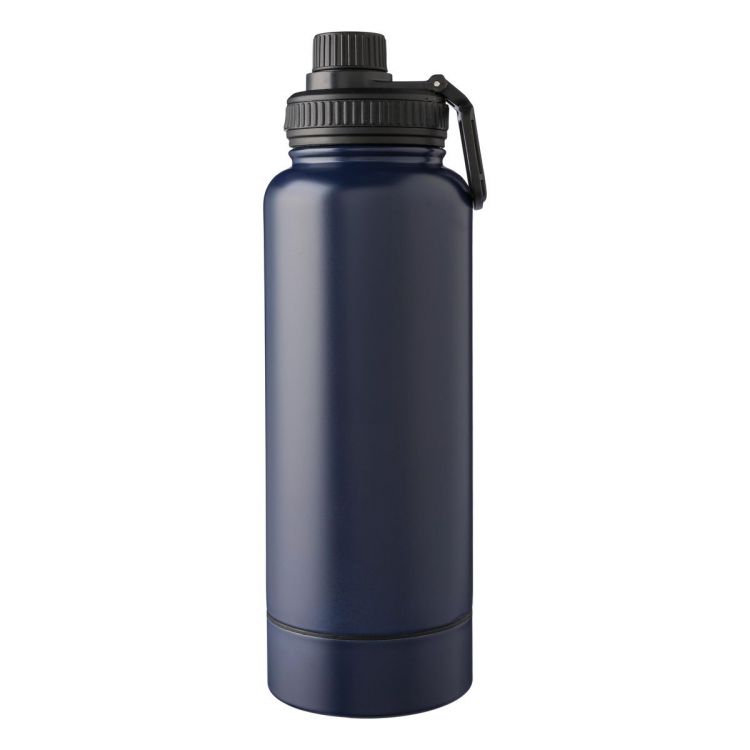 Botella de acero inoxidable de doble pared (1000 ml). Cuenta con una tapa de PP con un dispensador de rosca y un asa. La parte inferior incluye un pequeño compartimento de rosca para almacenamiento. Interior acero inoxidable 304 y exterior acero inoxidable 201. Presentada en una caja de cartón marrón.