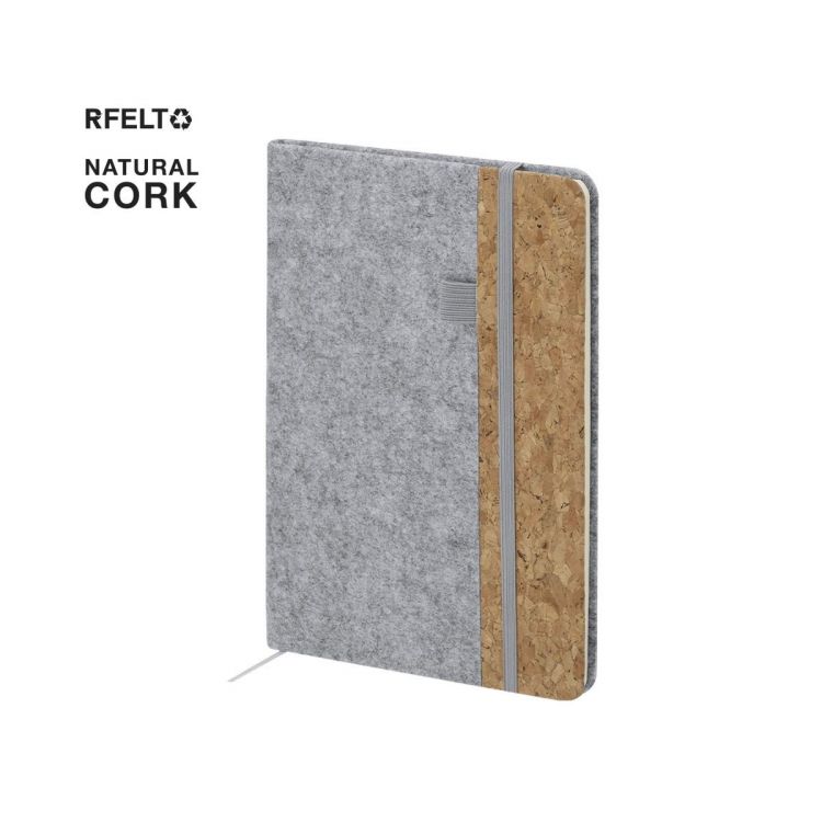 Bloc de notas con tapas rígidas elaboradas en combinación de fieltro RPET y corcho. Incluye 80 hojas a una raya con elástico de sujeción para bolígrafos en portada, banda elástica de cierre y marcapáginas a juego. Incliye distintivo RFELT.Elaborado con elementos vegetales para así fomentar la utilización de materias primas naturales y reducir las emisiones contaminantes.El fieltro RPET es fruto de la combinación del proceso de reciclaje de materiales plásticos junto con la técnica milenaria de fabricación del fieltro, dando como resultado un material de eco-tendencia que, además de ser de origen reciclado, también se convierte en reciclable.