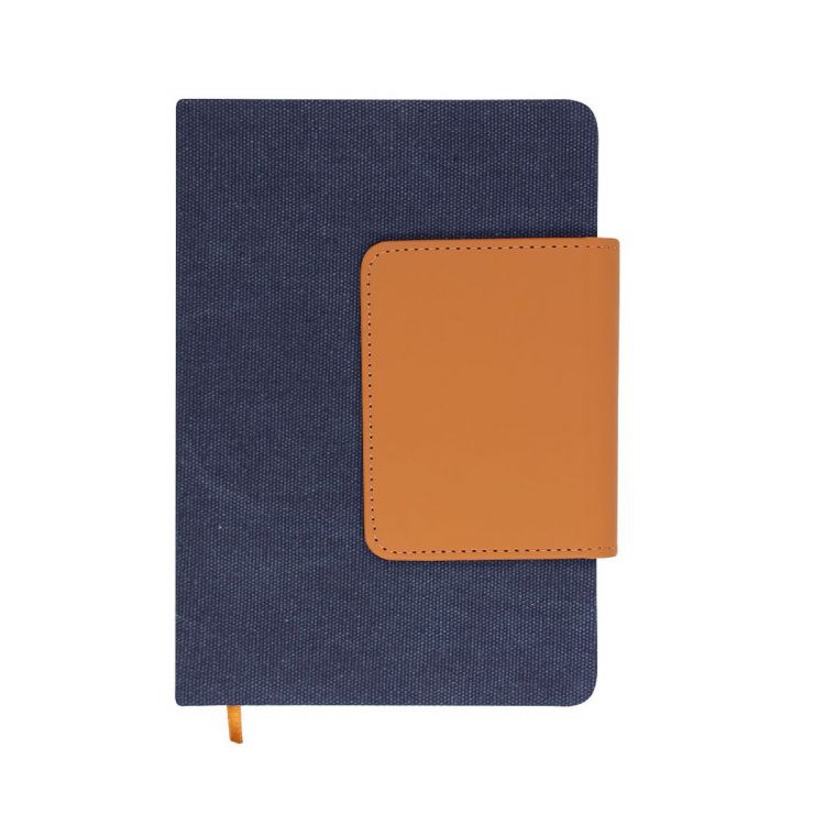 Bloc de notas A5 fabricado en combinación de Canvas Reciclado con PU Reciclado. De elegante diseño con solapa marrón de cierre magnético a juego, con práctico tarjetero en su interior. Interior con 80 hojas color crema de disposición a una raya y marcapáginas de tela a juego de la solapa. Con distintivo de PU Reciclado.La PU Reciclado destaca por su resistencia y elasticidad. Este material reciclado y reciclable es una opción sostenible que rescata las fibras desechadas en los procesos de fabricación, minimizando así el desperdicio de material y contribuyendo a su vez a reducir el impacto ambiental, manteniendo a la vez sus propiedades originales.
