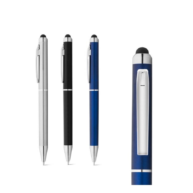 Bolígrafo ABS con acabado metalizado que dispone de mecanismo de giro, clip y puntero táctil. Escritura de color negro. ø10 x 145 mm