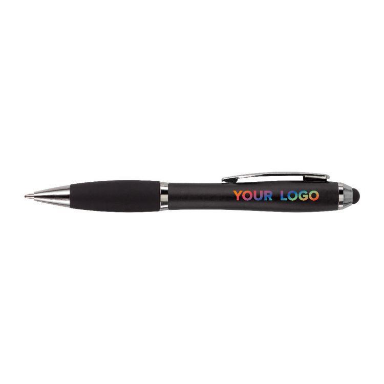 Bolígrafo de ABS con antideslizante de caucho en color negro y puntero táctil. Clip, pulsador y anilla plateados. Tinta negra, en color blanco