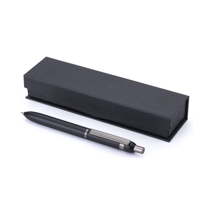 Bolígrafo de aluminio y latón con detalles brillantes en clip, anilla y pulsador. Tinta azul. Presentado en una caja de regalo magnética con funda corredera de papel.