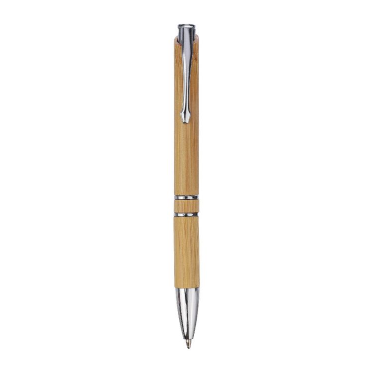 Bolígrafo de bambú con detalles cromados. Las anillas, el pulsador y la punta son de plástico y el clip de metal. Aprox. 800 metros de longitud de escritura. Tinta negra.