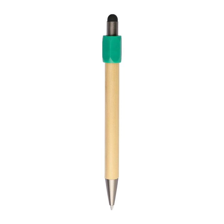 Bolígrafo de bambú con función de spinner de ABS reciclado y puntero táctil negro en el pulsador. Plumín de 1,0 mm y tinta azul con una longitud de escritura aproximada de 800 metros. Incluye un logotipo indicado que es material reciclado.