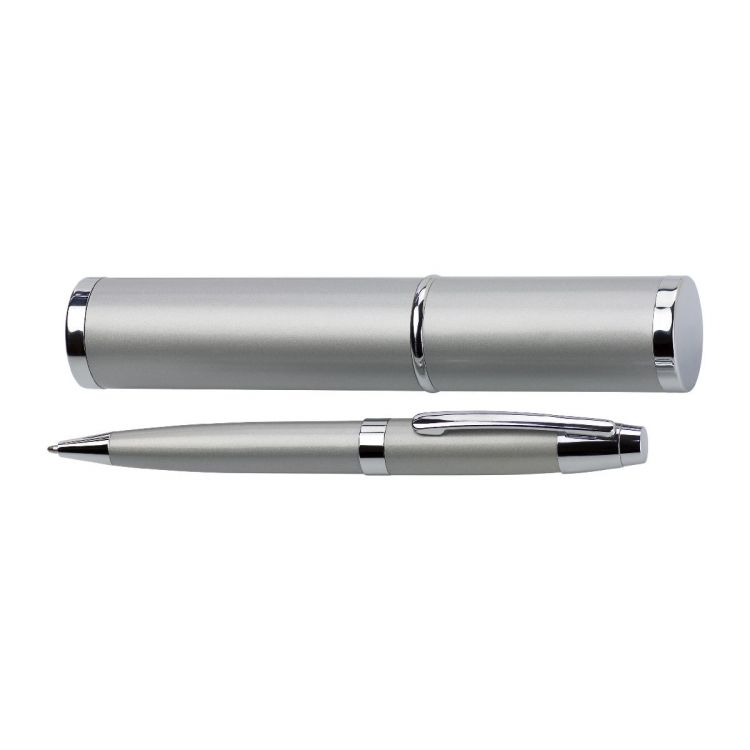 Bolígrafo metálico con tinta negra. Presentado en un estuche tubular a juego.