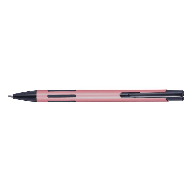 Bolígrafo metálico lacado con pulsador. La punta y el clip son negros y hacen juego con las tiras de caucho, que proporcionan un mejor agarre. Tinta azul.