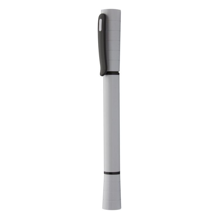 Bolígrafo de plástico con linterna LED. Se entrega con recambio azul y pilas de botón, de color blanco