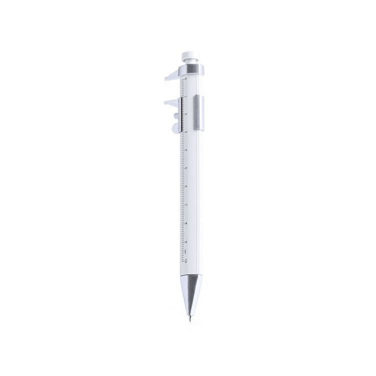 Bolígrafo pie de rey de mecanismo giratorio. Con regla integrada en cuerpo de 10cm. Tinta azul. (color blanco)