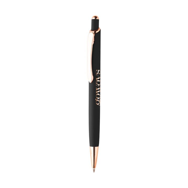 Bolígrafo de aluminio reciclado con acabado engomado y detalles en oro rosa. Con revestimiento especial para grabado láser espejo en color oro rosa. Con recarga azul.