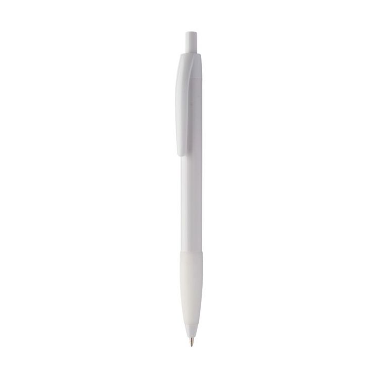 Bolígrafo de plástico con empuñadura de goma del mismo color. Con recambio azul.