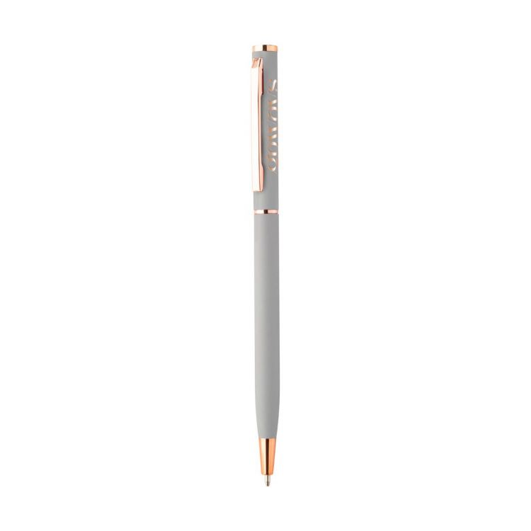 Bolígrafo giratorio de aluminio reciclado con acabado engomado y detalles en oro rosa. Con revestimiento especial para grabado láser espejo en color oro rosa. Con recarga azul.
