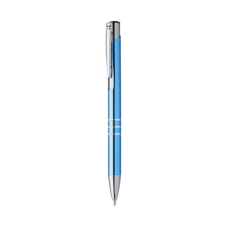 Bolígrafo de aluminio reciclado con acabado metálico y recarga azul.