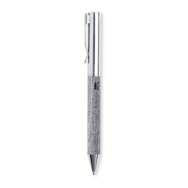 Bolígrafo fabricado en metal cromado y con cuerpo recubierto en poliéster RPET, elaborado a partir de plástico reciclado para así fomentar la reutilización de residuos plásticos y ayudar a la sostenibilidad del planeta. Elegante clip metálico y accesorios a juego, de mecanismo giratorio y en tinta azul. Con distintivo RPET en cuerpo y presentado estuche kraft con funda a juego. (color plata)