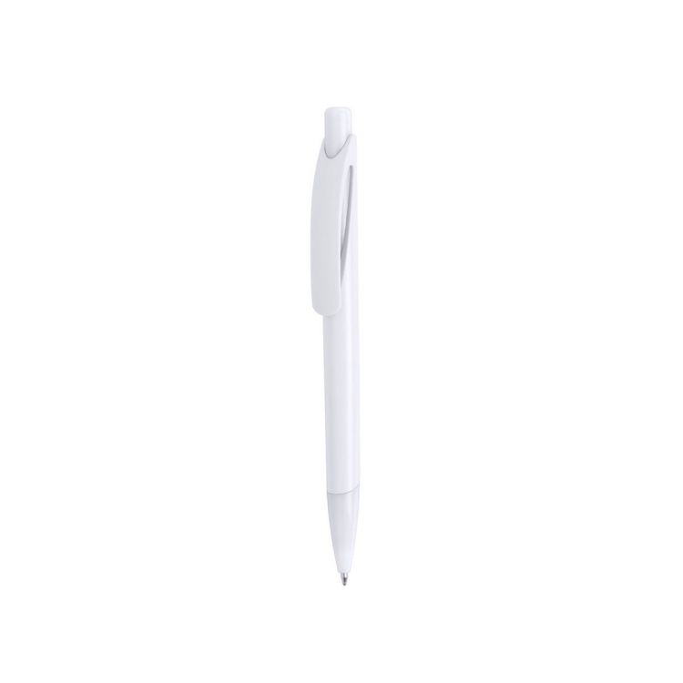 Bolígrafo de mecanismo pulsador de atrevido diseño bicolor con accesorios en vivos colores sólidos y cuerpo de suave acabado en color blanco sólido. Con original clip curvado a y punta a juego. Tinta azul.