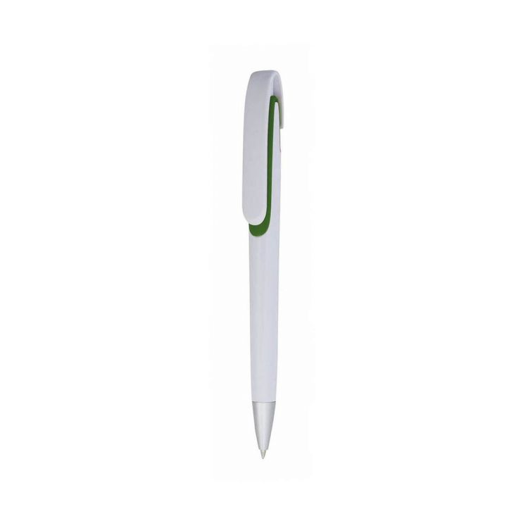 Bolígrafo de mecanismo pulsador de atrevido diseño tricolor con accesorios en vivos colores y cuerpo de suave acabado en color blanco sólido. Con original clip curvado a juego y cómoda empuñadura. Tinta azul.