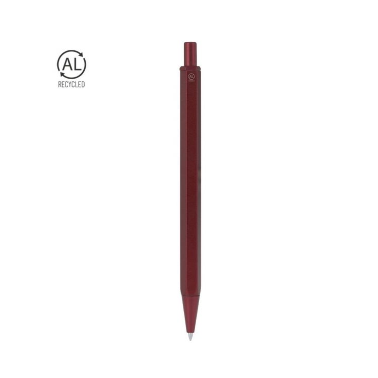 Elegante bolígrafo fabricado en Aluminio Reciclado. Cuerpo en distinguida forma hexagonal. De mecanismo pulsador fabricado en ABS Reciclado y de tinta azul. Con distinguido logo de Aluminio Reciclado marcado en la caña.El Aluminio Reciclado es un material con posibilidades de reciclaje casi infinitas, sin perder sus propiedades originales y consumiendo menos energía en este proceso.Certificación GRS (Global Recycled Standard / Estándar de Reciclaje Global), que garantiza el origen reciclado del material usado para fabricar el producto.El RABS es un plástico altamente reciclable de gran resistencia y con multitud de aplicaciones que lo convierten en una solución eco-friendly. Con certificación RCS, que garantiza el origen reciclado del mismo y con logo RABS grabado.
