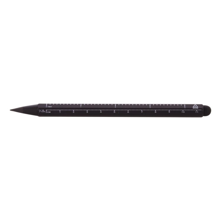 Bolígrafo sin tinta de aluminio reciclado de larga duración con puntero táctil y punta de aleación metálica, que oxida el papel. Con cuerpo hexagonal que incluye reglas de 11 cm y 4 pulgadas. Este bolígrafo escribe de forma similar a un lápiz, y además es borrable.