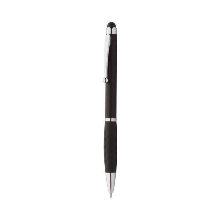 Bolígrafo de plástico y pantalla táctil con empuñadura de goma y recambio azul.
