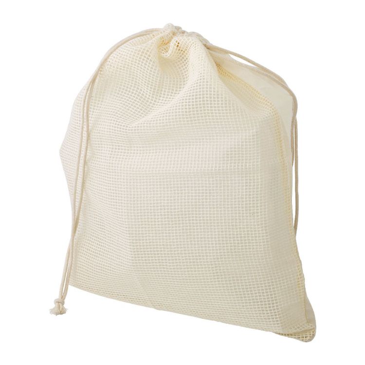 Bolsa 100% algodón orgánico para frutas y verduras, con rejilla en un lateral y cierre con cordón.