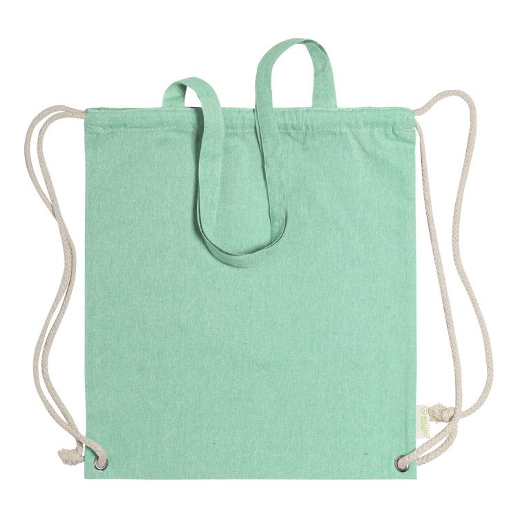 Bolsa de algodón reciclado con cordón, cordones gruesos trenzados y asas largas. También puede utilizarse como bolsa de la compra. 100% algodón reciclado, 140 g/m².