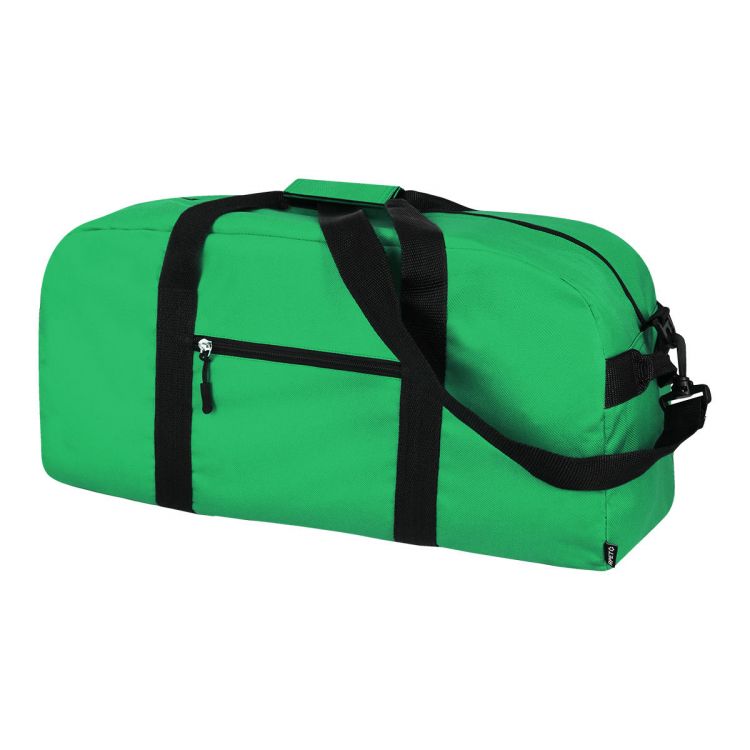 Bolsa de deporte RPET con compartimentos principales con cremallera y bolsillo frontal, correa ajustable para el hombro. Poliéster RPET 600D, con etiqueta distintiva RPET.